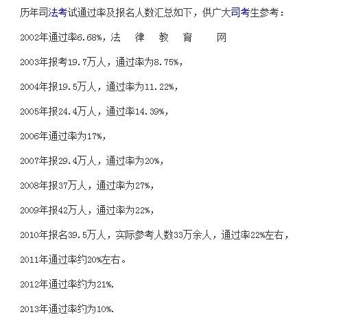 对比现在法考基本上10%的通过率,以前的法考通过率简直让人大喊“幸福”,而且现在法考不仅仅是考试那么简单了,还有专业等很多方面的限制,也就是说能去参加法考考试的人也基本上要求要专业出身才行,然后在在专业的一群人中以极低的通过率通过考试。这是个要命的活!