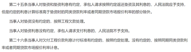 在关于垫资利息约定、欠付工程价款利息计付标准方面,新解释修改了原解释一中的“约定的利息计算标准高于中国人民银行发布的同期同类贷款利率的部分除外”,在第二十五条中重新规定:约定的利息计算标准高于垫资时的同类贷款利率或者同期贷款市场报价利率的部分除外。