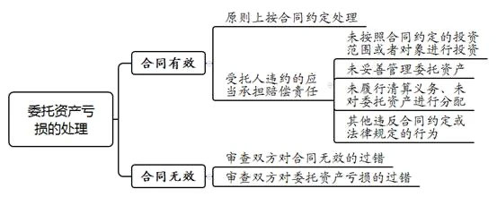 最后,在审查双方对合同无效及委托资产亏损过错的基础上,法院应对委托资产的损失作出妥当处理。此外,需要特别注意的是,因投资理财具有高风险性,无论合同是否有效,对于受托人是否尽到审慎义务不能仅凭理财结果进行判断,而应依据受托人的受托理财行为进行判断。